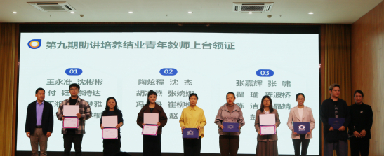 首先,教师发展中心主任费群蝶从六个方面总结了第九期助讲培养工作经验,指出了存在的不足以及改进的方向。她提出,要继续贯彻院校两级相互配合,共同支持青年教师的专业发展,加强考核、层层把关,在制度上明确规范导师的培养任务和青年教师的学习目标,切实保障青年教师助讲培养工作落实到位。30位青年教师通过第九期助讲培养考核,如期取得结业证书。各教学单位分管领导为他们颁发了结业证书。